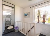 1e verdieping: lichte overloop, 3 slaapkamers ca. 400×300, 320×240 en 350×344 waarvan 2 met vaste kasten, badkamer met douchecabine, wastafelmeubel en 2e toilet.