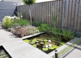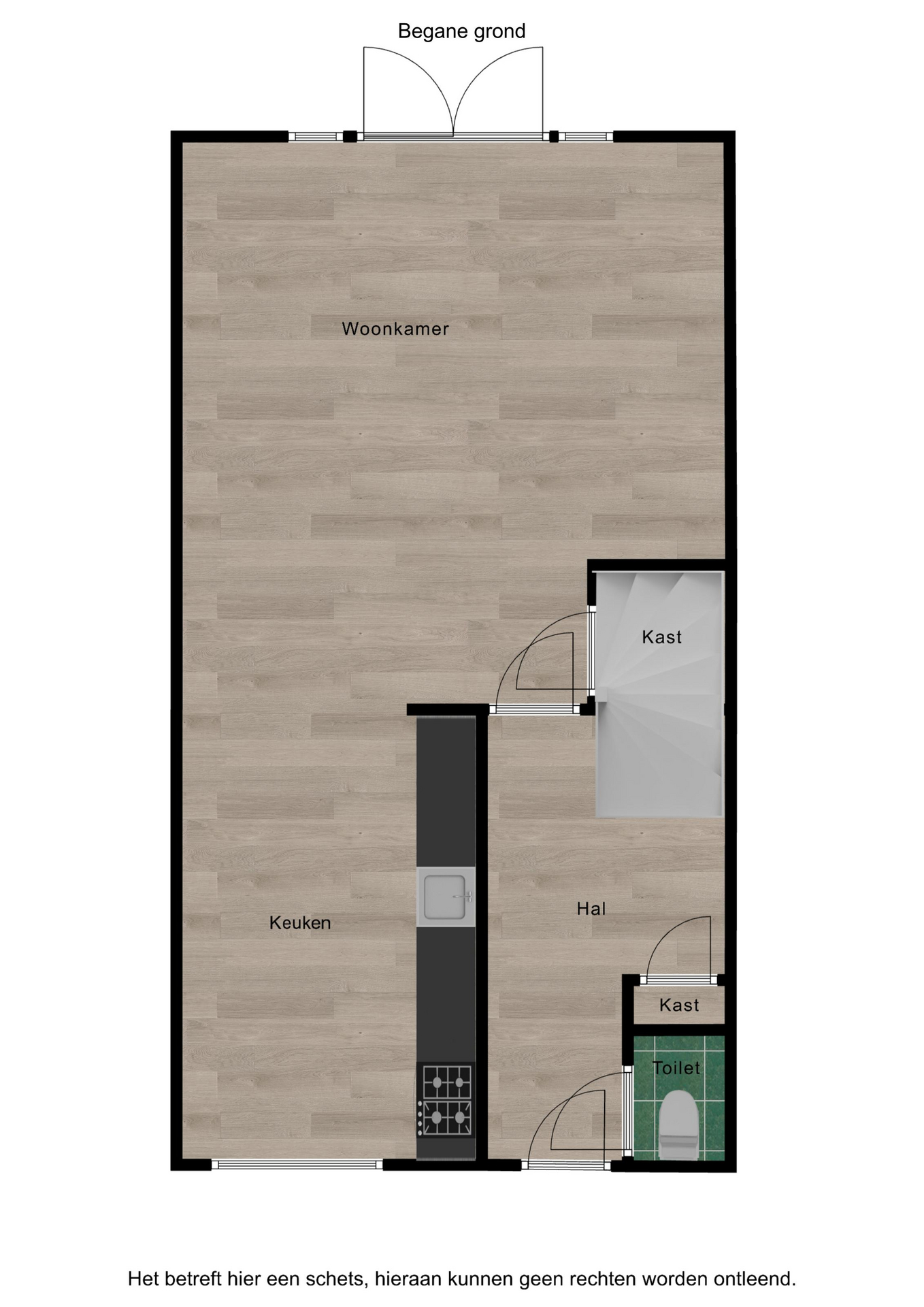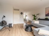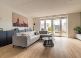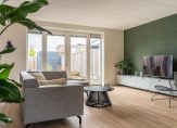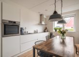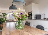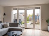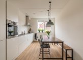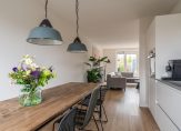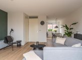 Indeling: hal/entree, modern betegeld toilet, tuingerichte woonkamer (ca. 580×540) met openslaande deuren naar de tuin, open keuken met inbouwapparatuur (ca. 445×295). De begane grond is v.v. vloerverwarming en laminaat.
