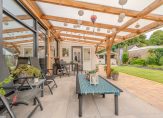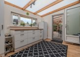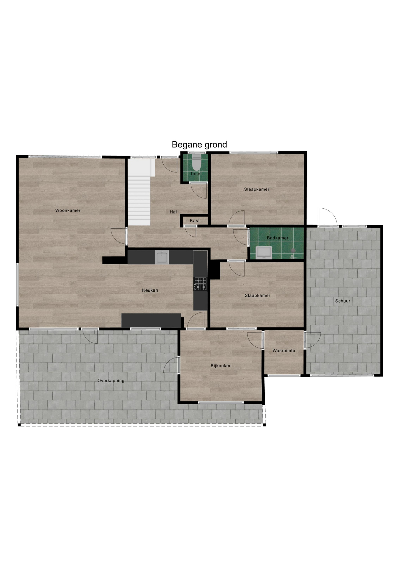 Begane grond: entree/hal, modern betegeld toilet, woonkamer met deur naar de overkapping ca. 730×452, open keuken (2022) met inbouwapparatuur en veel kastruimte. bijkeuken met extra keukenblok, wasmachineruimte. Twee slaapkamers ca. 400×280 en 400×300, moderne badkamer met inloopdouche en wastafelmeubel. De begane grond is v.v. een nieuwe laminaatvloer.