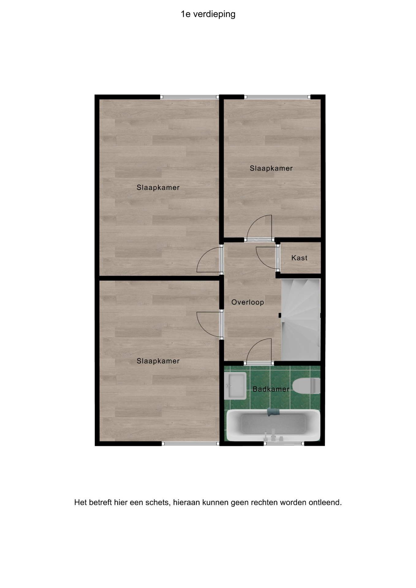 1e verdieping: overloop met vaste kast, 3 slaapkamers ca. 440×300, 400×300 en 345×245, badkamer met ligbad, wastafel en 2e toilet.