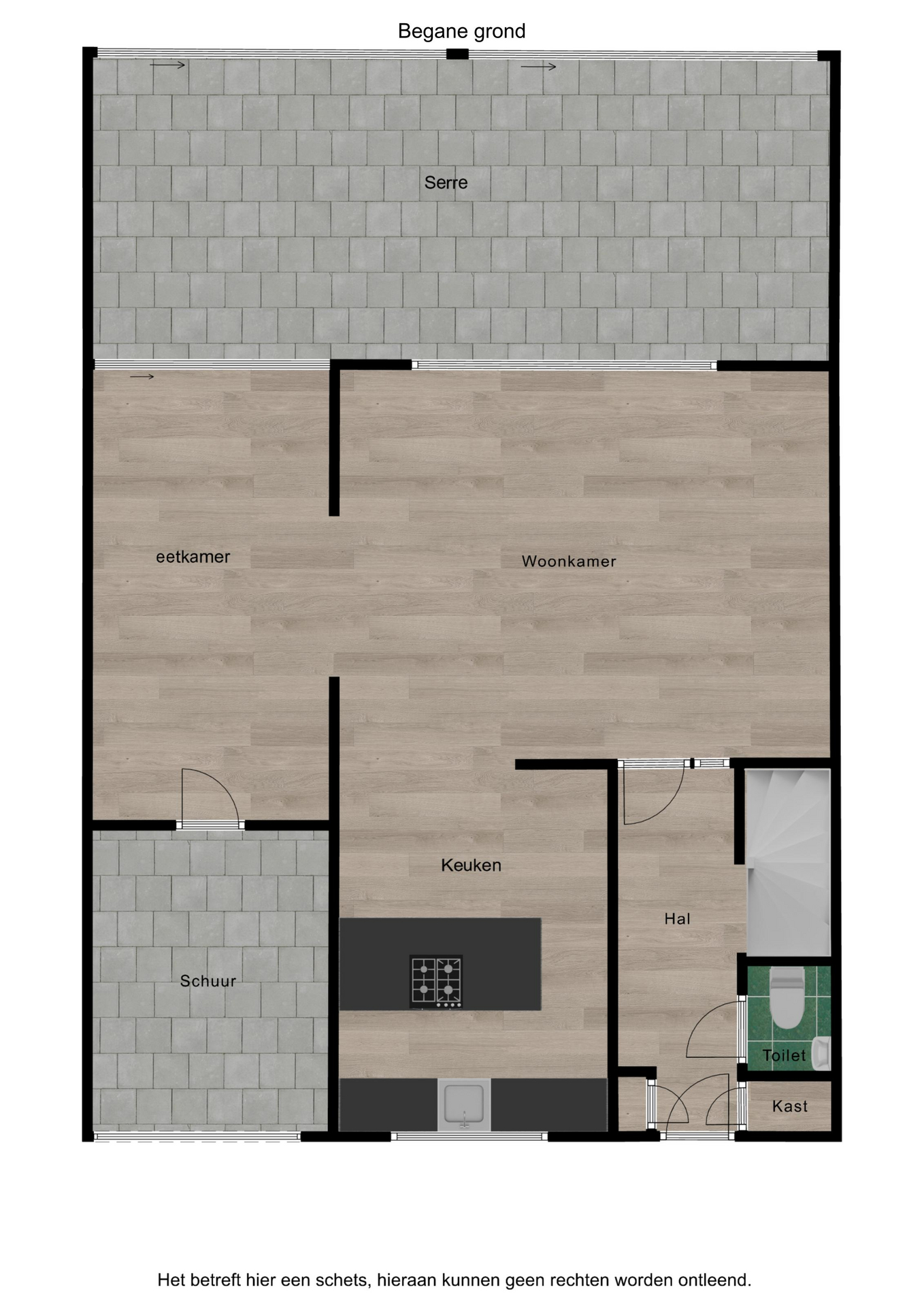Begane grond: entree/hal met garderobekast, toilet, tuingerichte woonkamer ca. 550×435, moderne open keuken (2022) v.v. inbouwapparatuur ca. 400×300, eetkamer ca. 515×270.