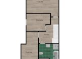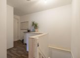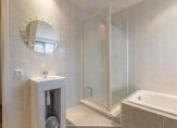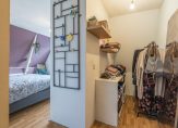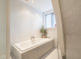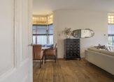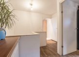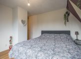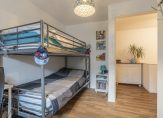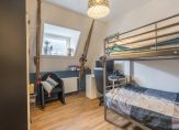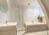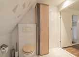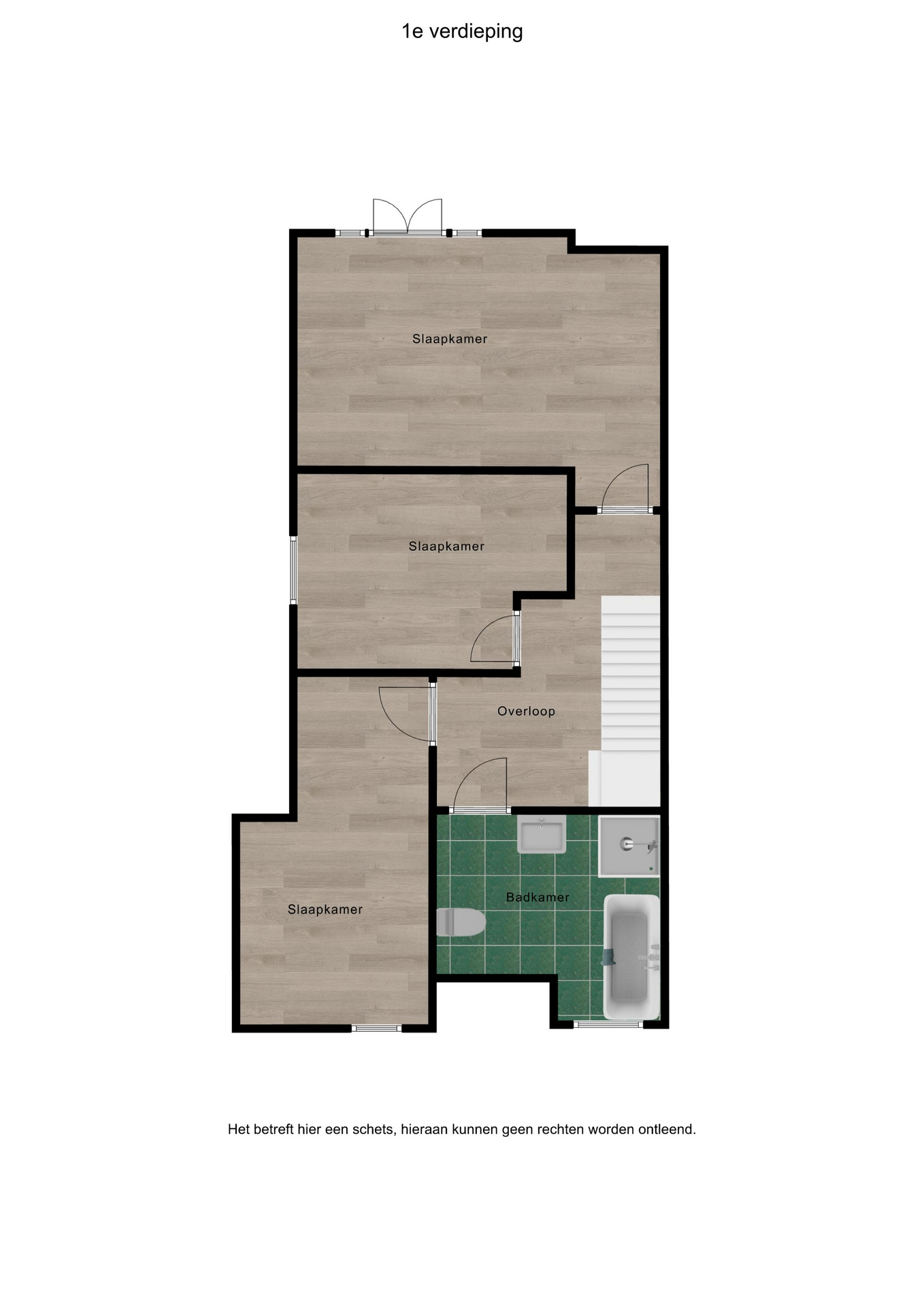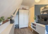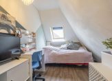 Eerste verdieping: ruime lichte overloop, 3 slaapkamers (circa 380×170, 380×280 en 495×353) waarvan één met balkon op het westen. badkamer met douchecabine, ligbad, wastafel, 2e toilet en mechanische ventilatie.