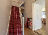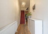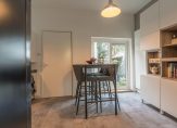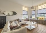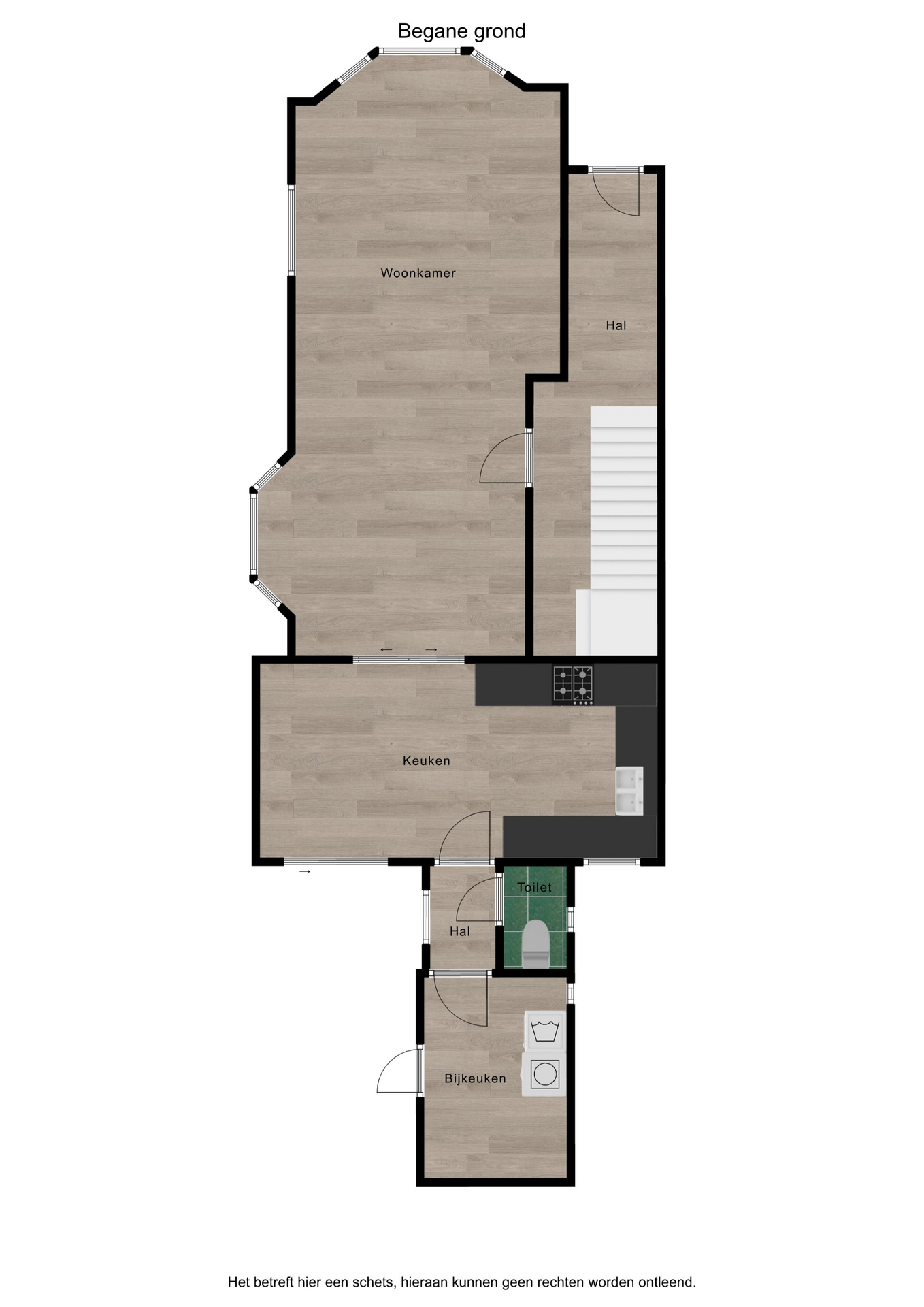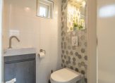 Begane grond: entree/hal, ruime woonkamer (ca. 33 m²) met erkers en houtkachel, suite deuren naar de woonkeuken en schuifpui naar de besloten achtertuin, hal, modern toilet met fontein.