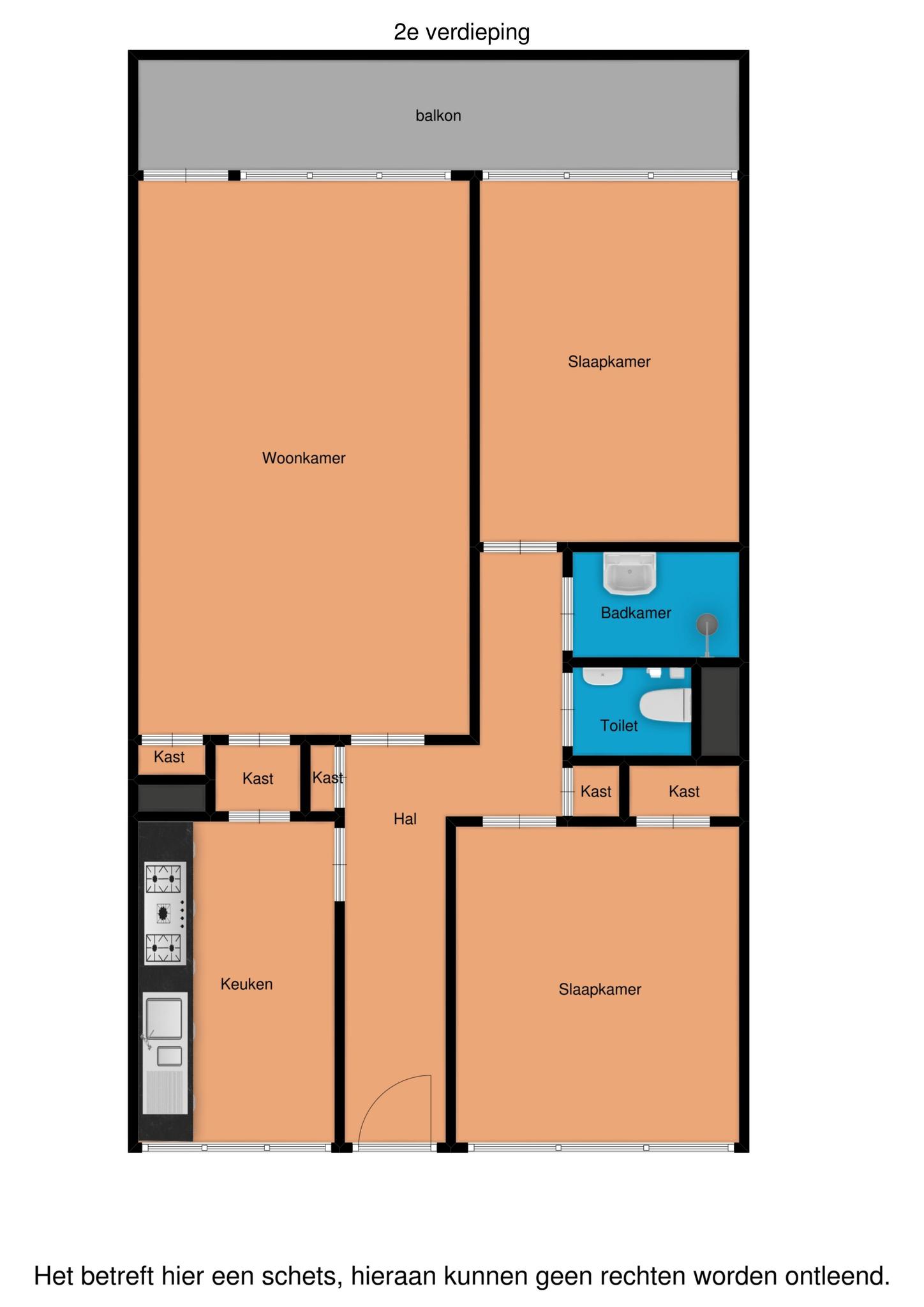 Indeling appartement: tochtportaal, hal met vaste kast, toilet, woonkamer ca. 700×375 met vaste kast en toegang naar balkon op het zuiden, keuken met vaste kast, 2 slaapkamers waarvan één met vaste kast resp.: 11 en 12 m², badkamer met douche. Het appartement is grotendeels v.v. laminaatvloeren.