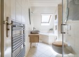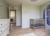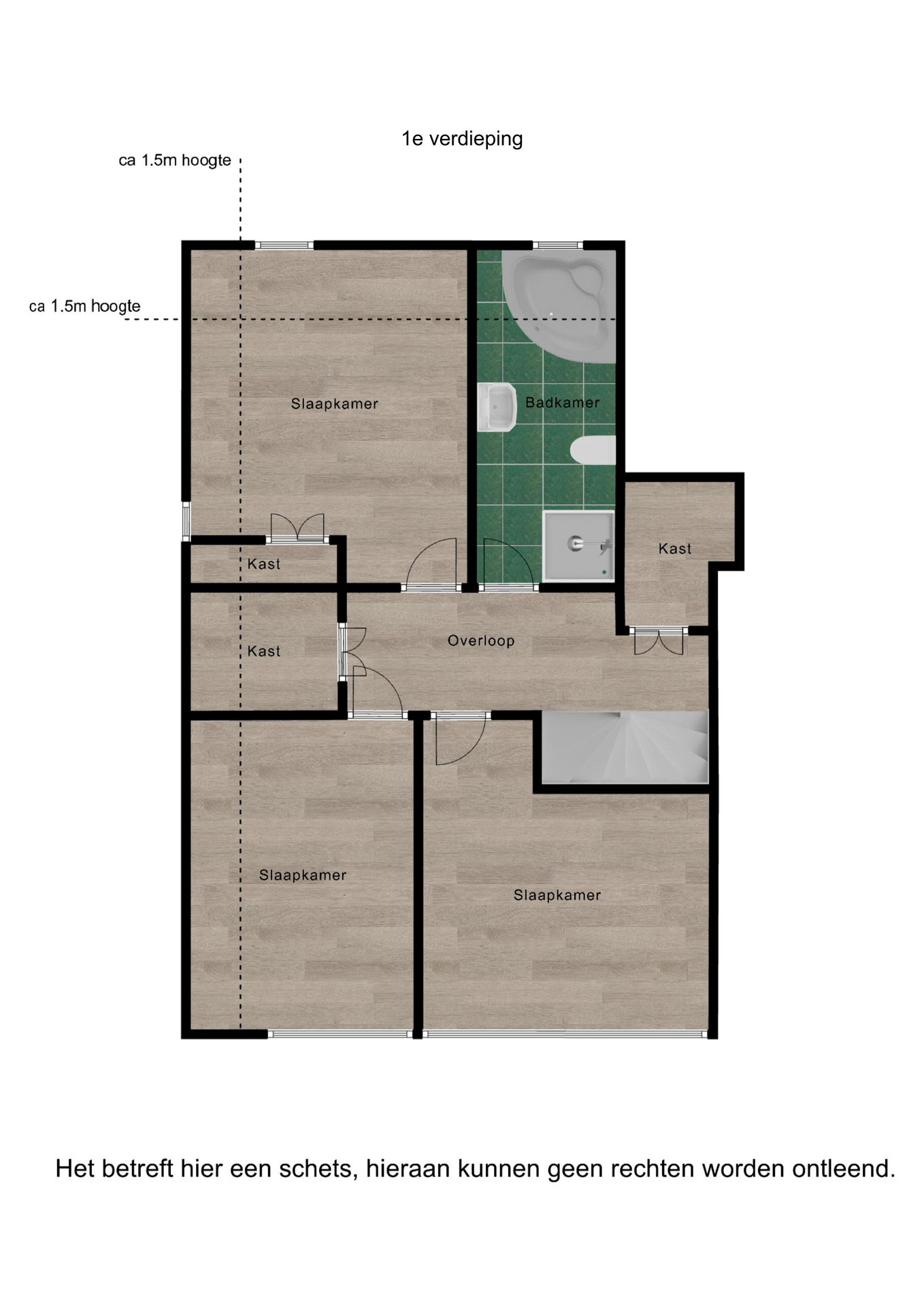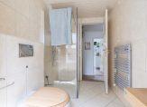 1e verdieping: overloop, 3 slaapkamers ca. 350×300, 375×285 en 410×340 v.v. laminaat of houten vloerdelen, fraaie badkamer met royale inloop stortdouche, hoekbad, wastafelmeubel en 2e toilet.