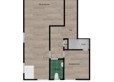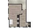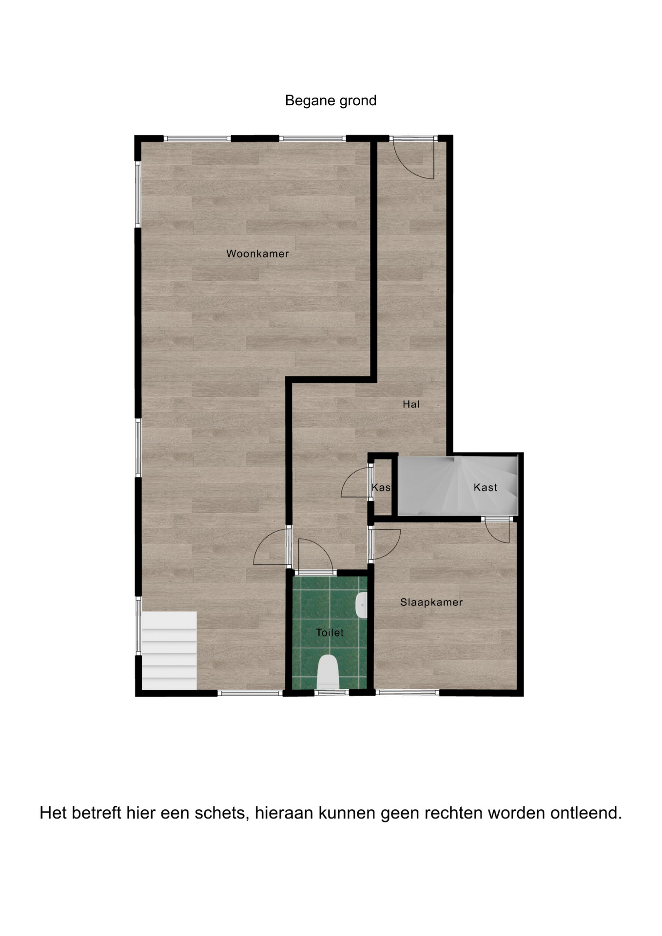 Begane grond: entree/gang, toilet, woonkamer ca. 30 m² met parketvloer, slaapkamer ca. 290×250 met laminaat en vaste kast.