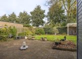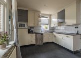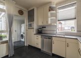 Begane grond: hal/entree met garderobehoek, toilet, lichte woonkamer ca. 35 m² met laminaatvloer en openslaande deuren naar de fraai aangelegde tuin op het oosten, half open keuken ca. 335×235 met inbouwapparatuur, keukenboiler en plavuizen, bijkeuken met plavuizen.