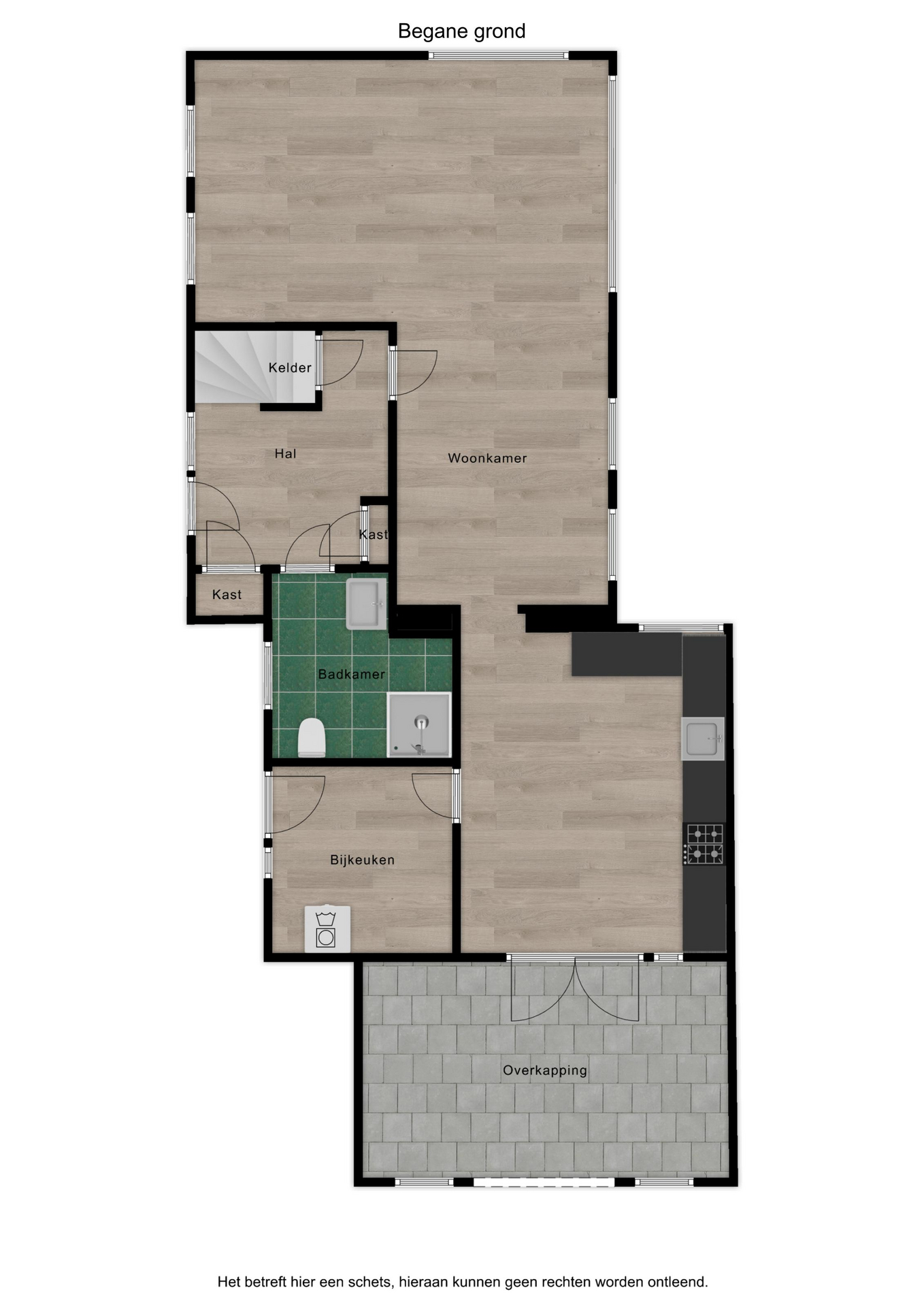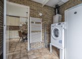 Begane grond: hal/entree met vaste kast, toegang naar de kelder, l-vormige woonkamer ca. 30 m² v.v. laminaat en sfeervolle open haard, woonkeuken ca. 15 m² v.v. inbouwapparatuur en middels openslaande deuren toegang naar de achtertuin met overkapping, moderne badkamer met inloopdouche, wastafel en toilet, bijkeuken met witgoedaansluiting.