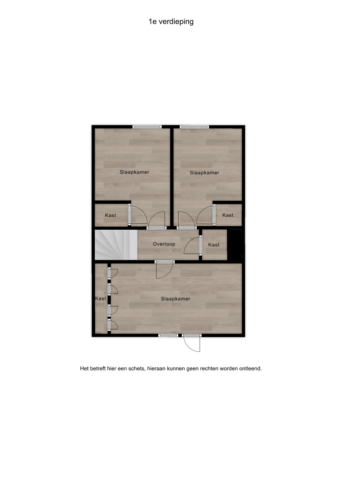 Eerste verdieping: overloop v.v. vaste kast, 3 slaapkamers met vaste kast van circa 480×260, 360×210 en 360×210
