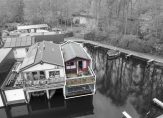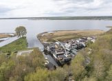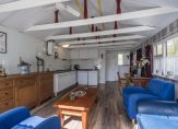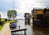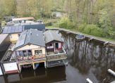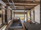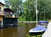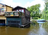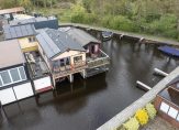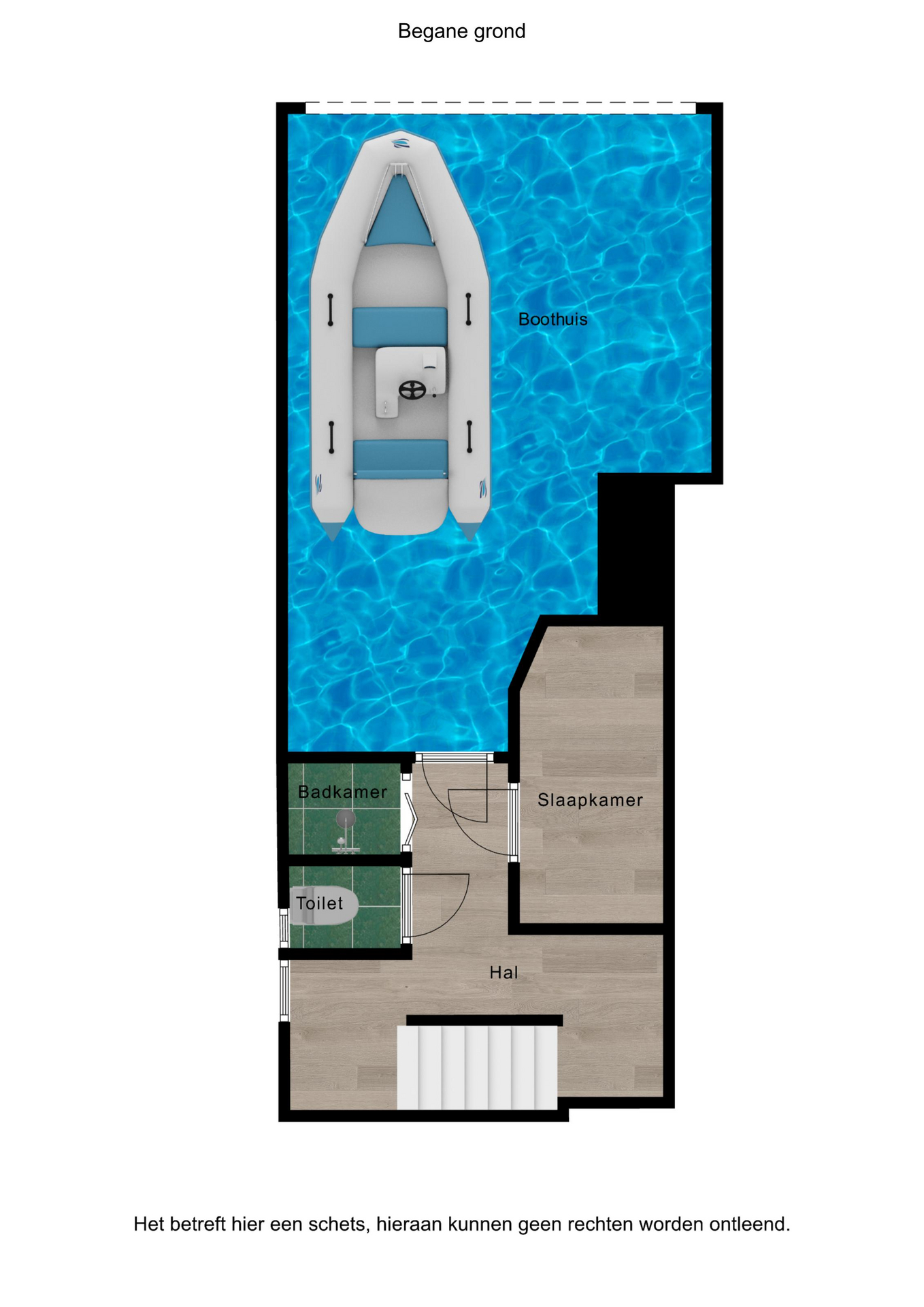 Hal/entree, toilet, douche, bedstee, berging en boothuis met een ligplaats voor twee boten ca. 650×395.