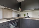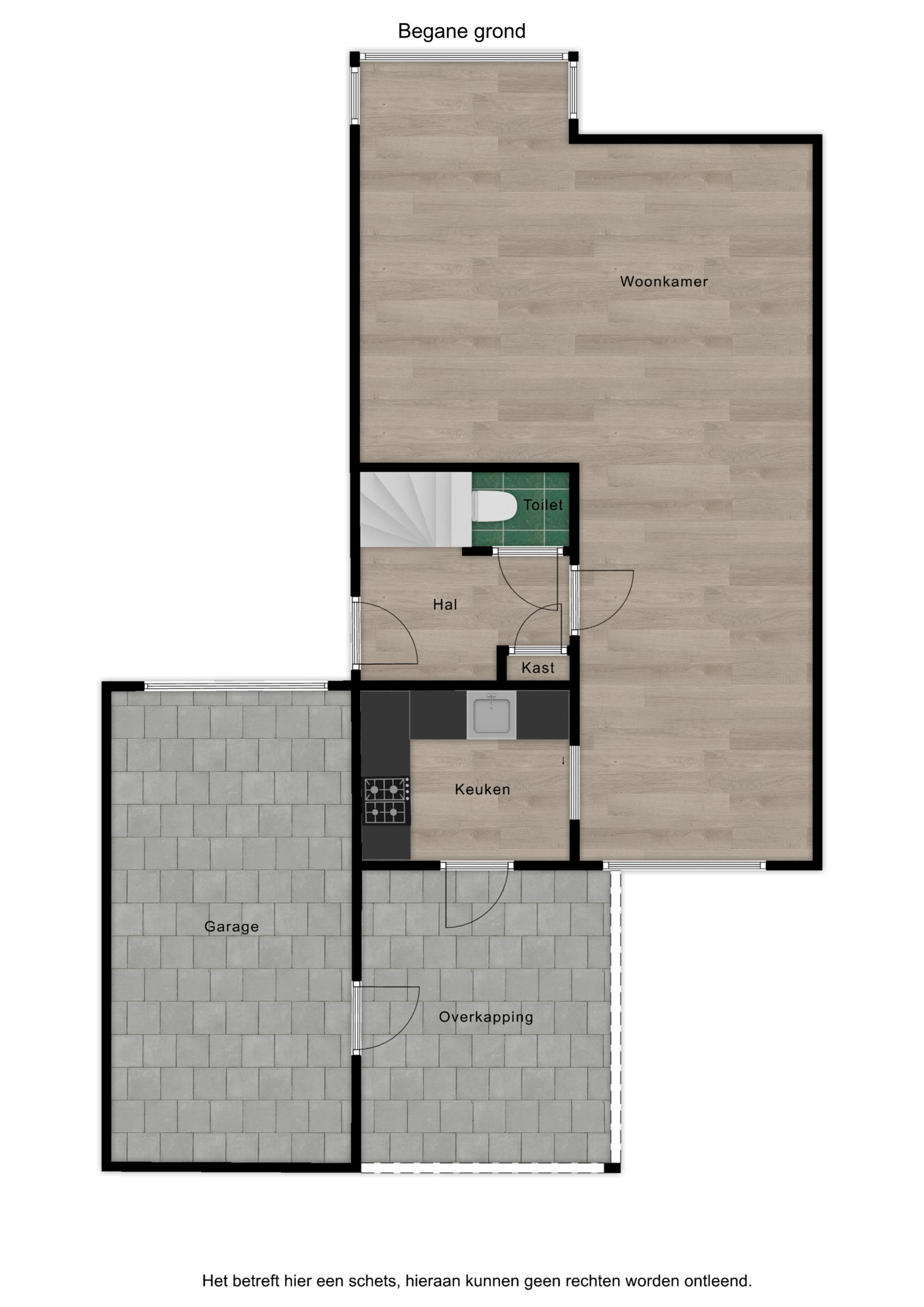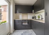 Begane grond: hal/entree met PVC vloer, modern toilet, L-woonkamer met erker en houten vloer, moderne half-open keuken met inbouwapparatuur en toegang tot de tuin