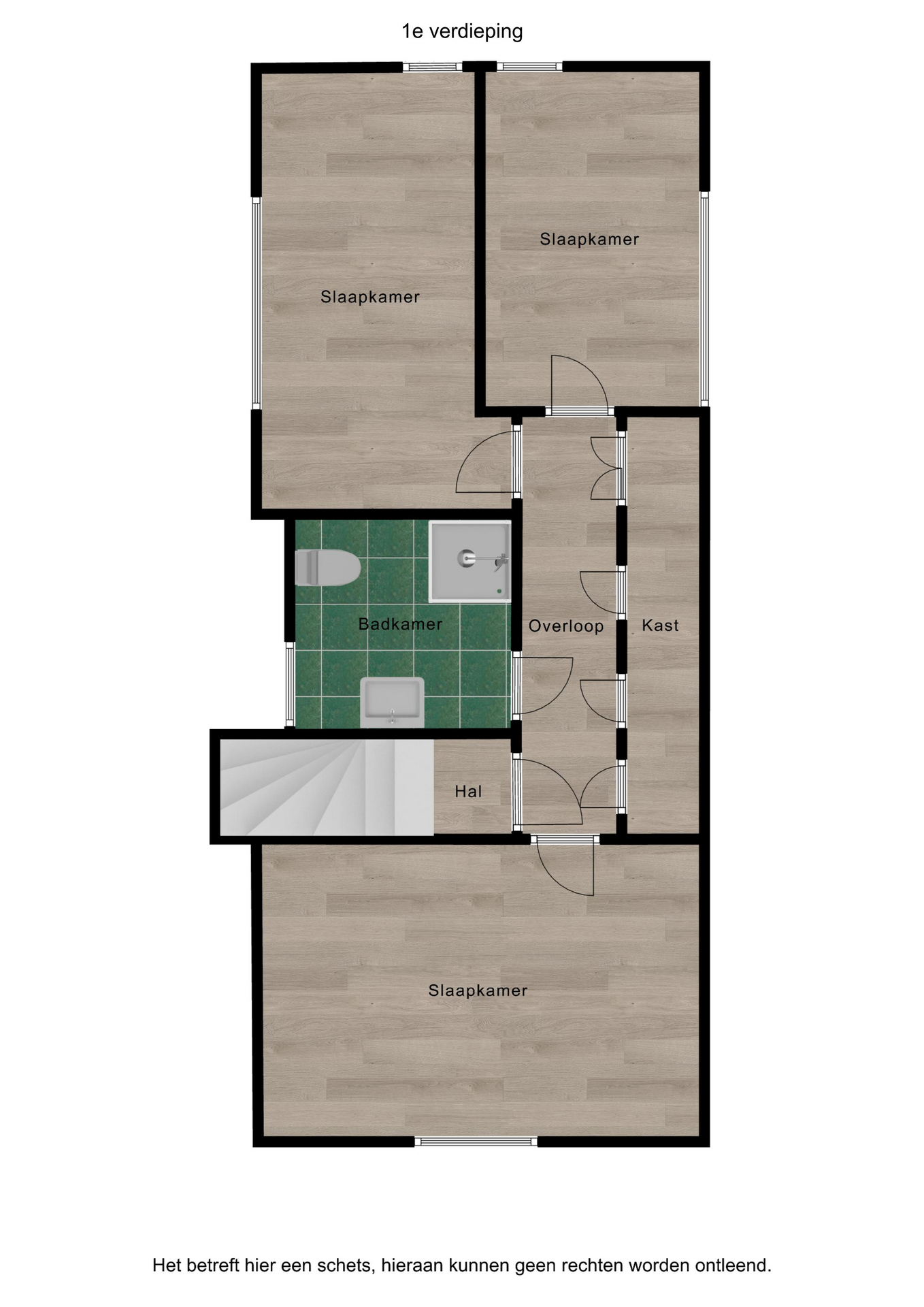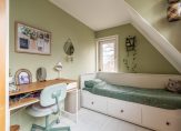1e verdieping: v.v. laminaat, overloop met berging, 3 slaapkamers ca. 380×315, 475×215 en 360×225, moderne badkamer met stortdouche, wastafelmeubel en 2e toilet.