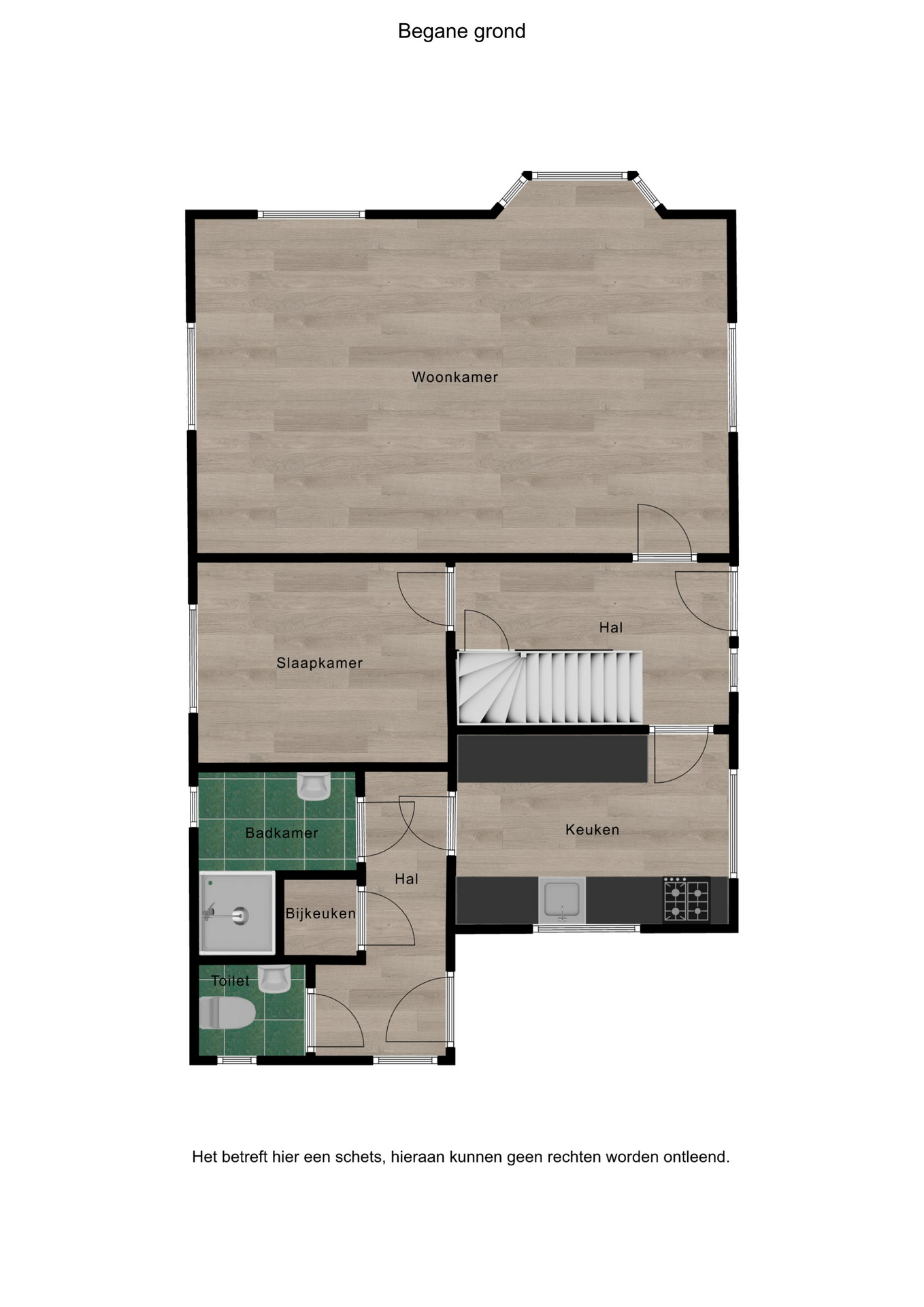 Indeling: hal/entree met laminaat, woonkamer (ca. 650×415) met erker en laminaatvloer, kelder, slaapkamer v.v. laminaat ca. 325×250, aparte keuken met inbouwapparatuur v.v. laminaat (ca. 340×240), hal met toilet, berging met wasmachine aansluiting, badkamer met douche en wastafel.