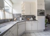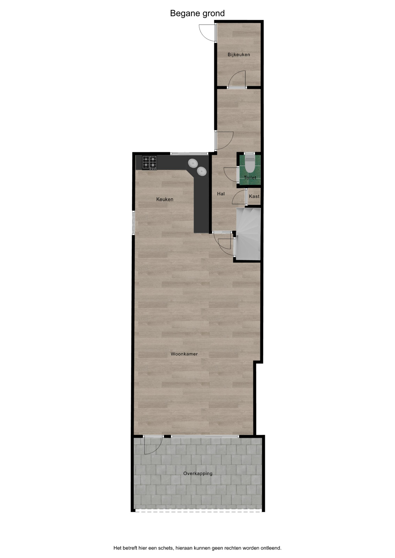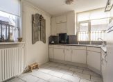 Begane grond: hal/entree, toilet, extra ruime woonkamer van ca. 37,5 m² voorzien van plavuizen en trapkast, open keuken met inbouwapparatuur ca. 300×290, bijkeuken.