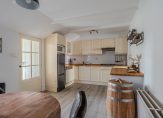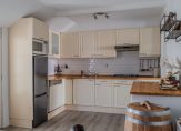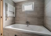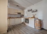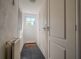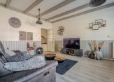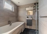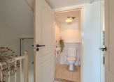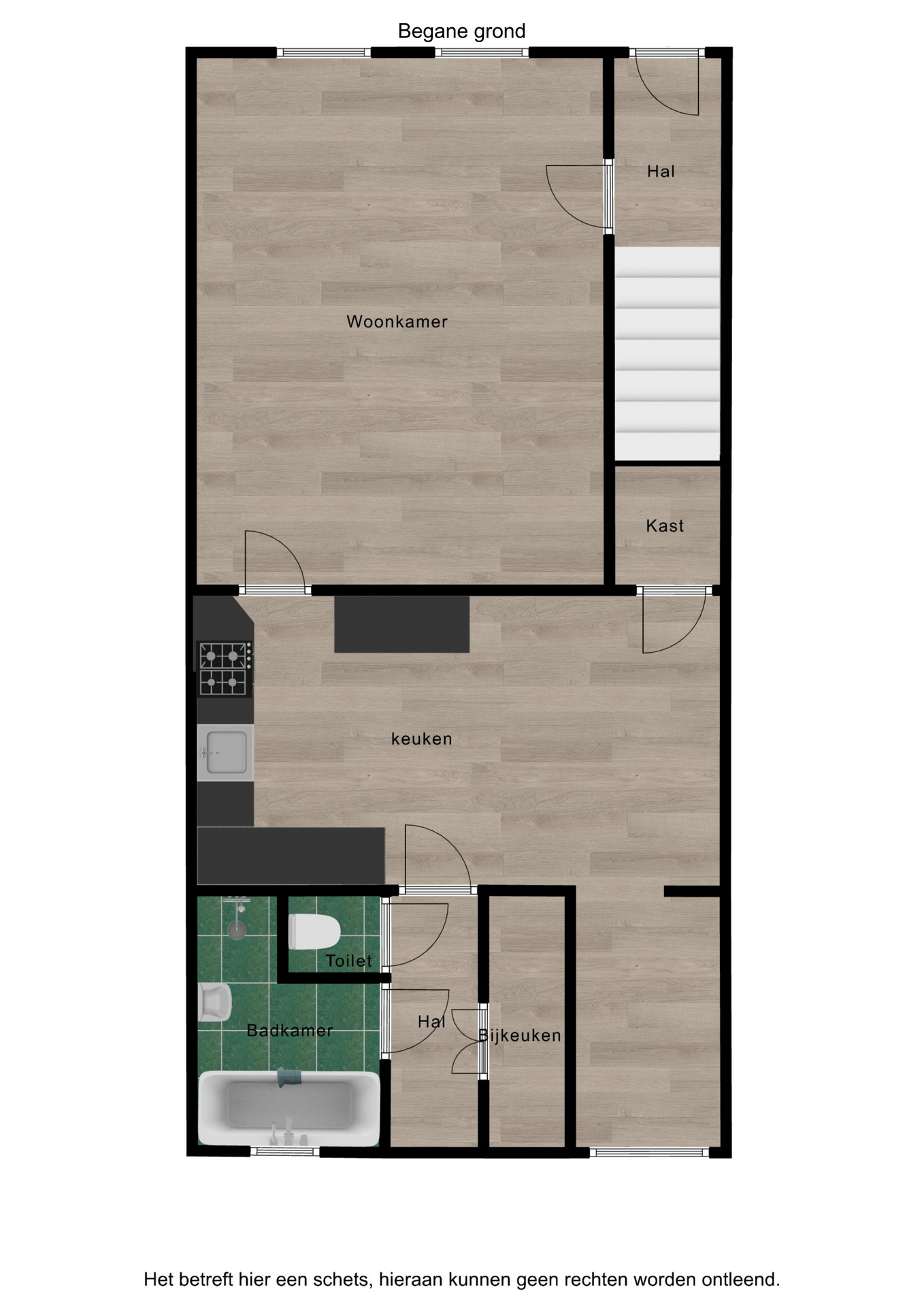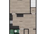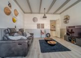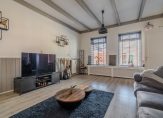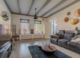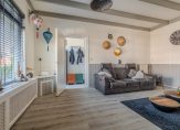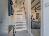 Begane grond: entree/hal met laminaat, woonkamer ca. 550×430 met sfeervol balkenplafond en laminaat, woonkeuken met inbouwapparatuur en laminaat ca. 550×300, werkkamer ca. 265×150, gang, toilet, moderne badkamer met ligbad en inloop(stort)douche, wasruimte.