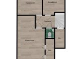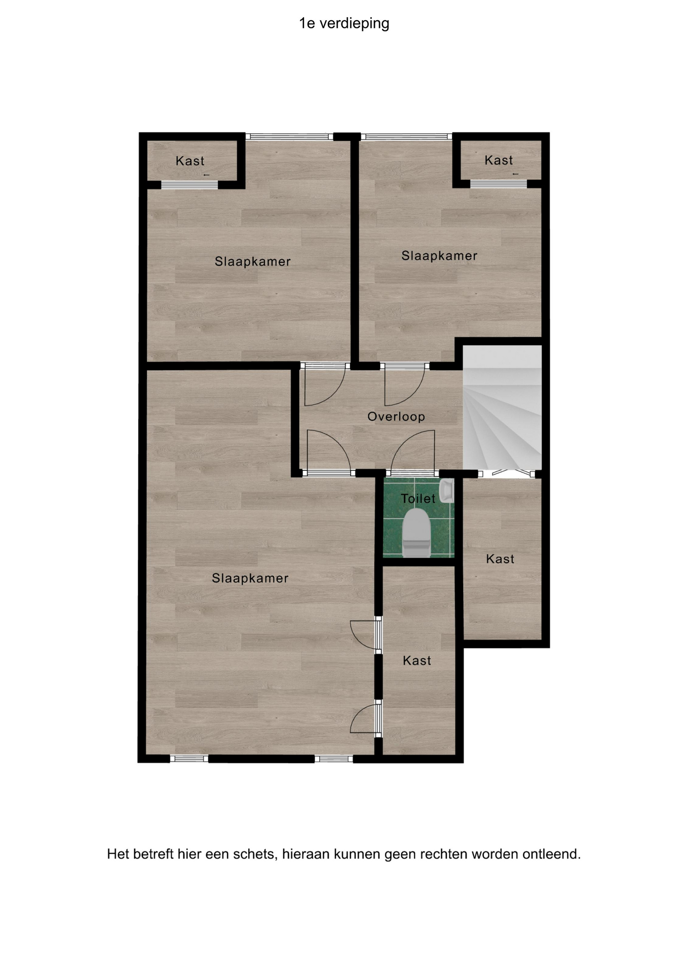 1e verdieping: overloop met laminaat, toilet, 3 slaapkamers ca. 260×250, 285×250 en 540×325 met vaste kasten.
