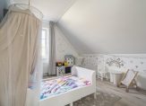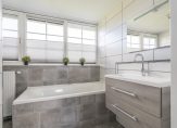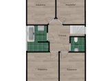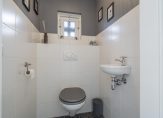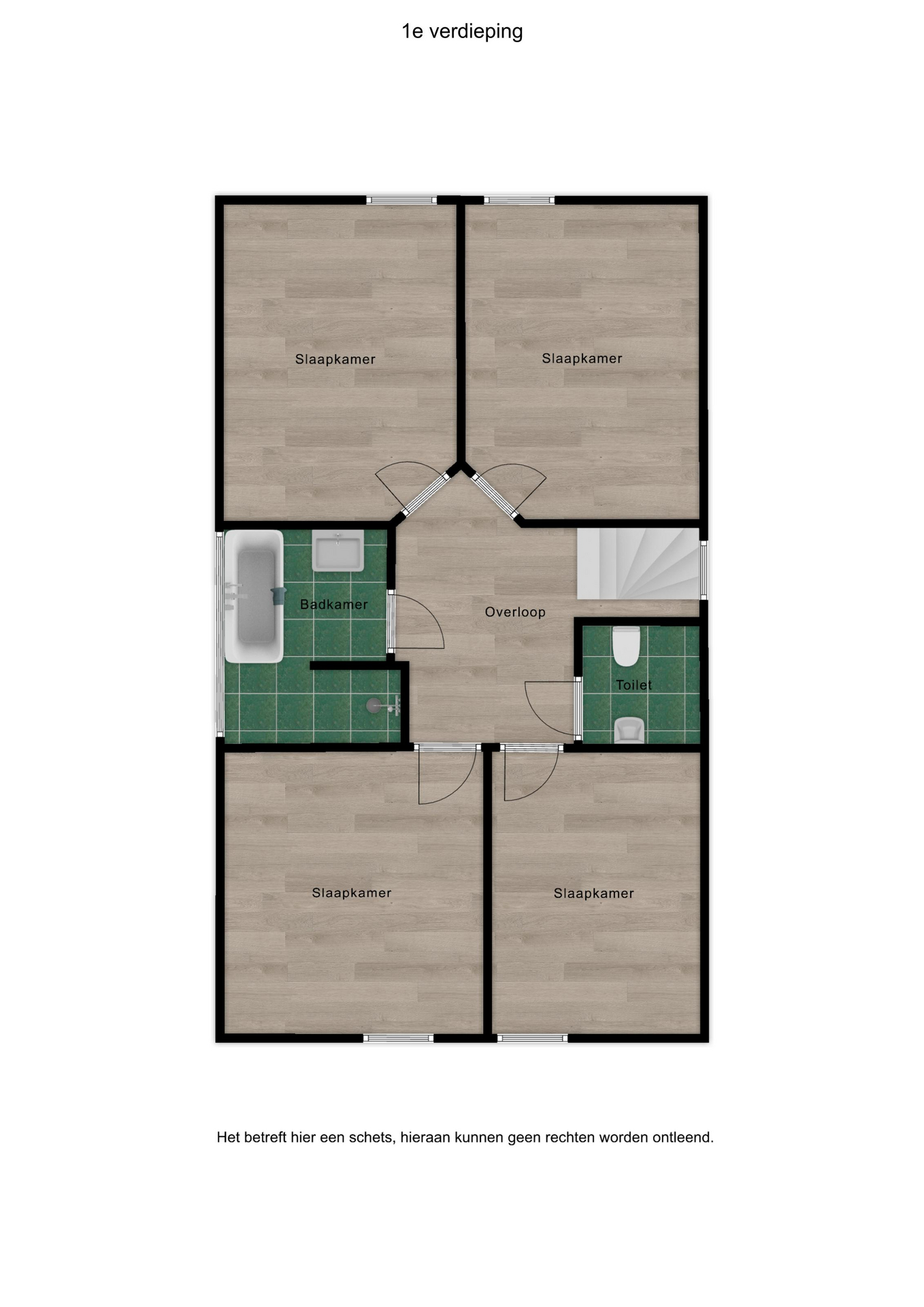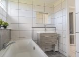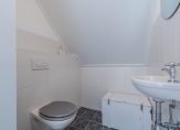 Eerste verdieping: overloop, 2e toilet, 4 slaapkamers v.v. laminaat van circa 380×255, 380×334, 425×280 en 425×280, badkamer met ligbad, wastafel en royale douche.