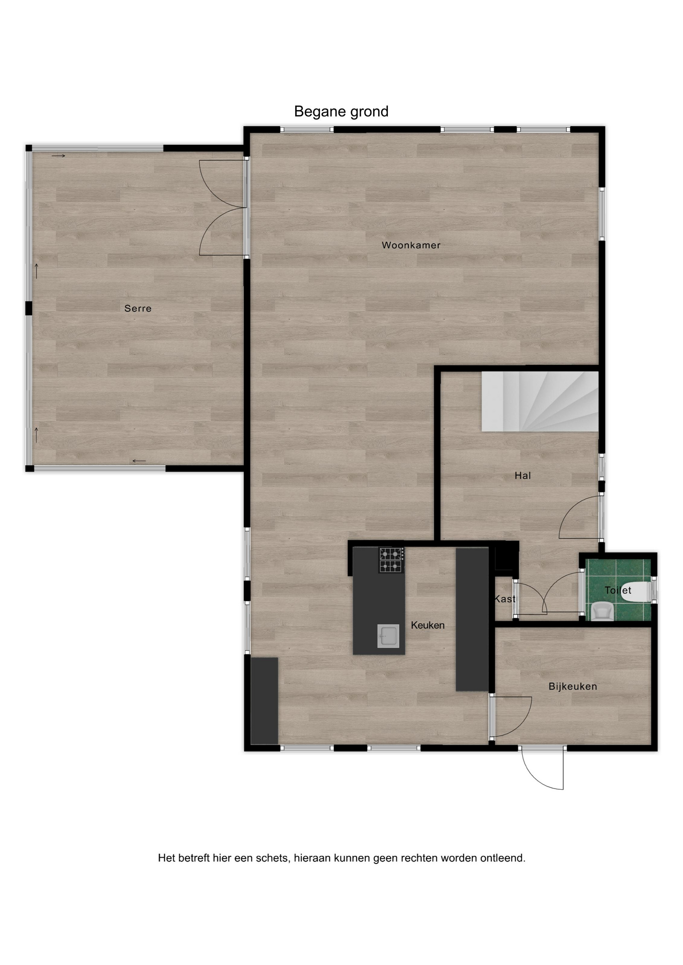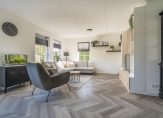 Begane grond: entree/hal met pvc vloer, toilet, woonkamer v.v. pvc vloer ca. 38 m² met openslaande deuren naar de fraaie volledig geïsoleerde tuinkamer (570×380) met zicht op de grote tuin, moderne keuken (2021) v.v. inbouwapparatuur, barretje en koffiehoek, bijkeuken met extra keukenblok en v.v. PVC vloer.