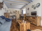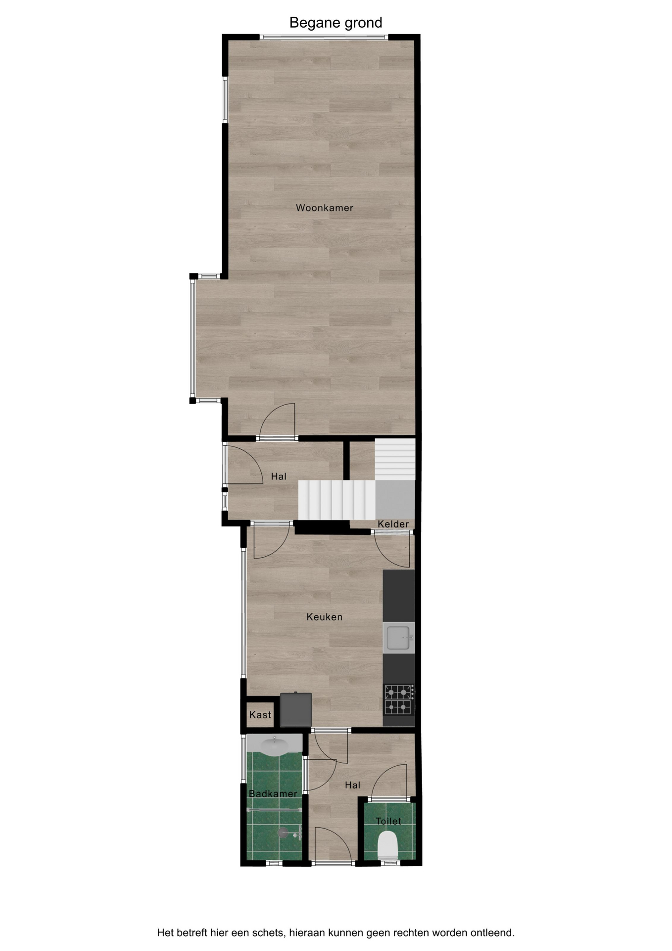 Begane grond: hal/entree, woonkamer van circa 25 m² met balkenplafond en parketvloer, moderne woonkeuken met inbouwapparatuur, kelder, (achter)hal, badkamer v.v. douche en wastafelmeubel, separaat toilet.