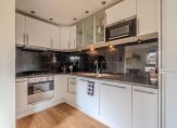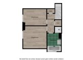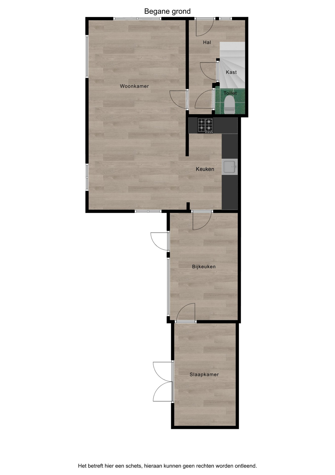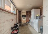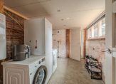 Begane grond: entree/hal met laminaat, modern betegeld toilet, woonkamer ca. 25 m² met laminaat, half open keuken met inbouwapparatuur en laminaat, ruime bijkeuken, slaap- of werkkamer ca. 385×230 met openslaande deuren naar de tuin.
