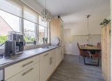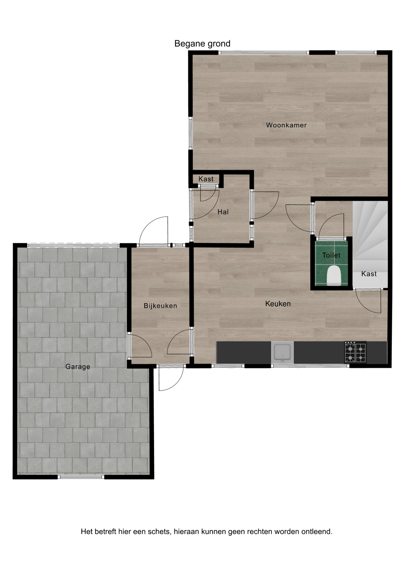 Begane grond: hal/entree, woonkamer ca. 510×395, woonkeuken ca. 510×300 met diverse inbouwapparatuur, voorraadkast, bijkeuken met toegang tot de ruimte tuin en stenen garage, (achter)halletje en modern toilet.